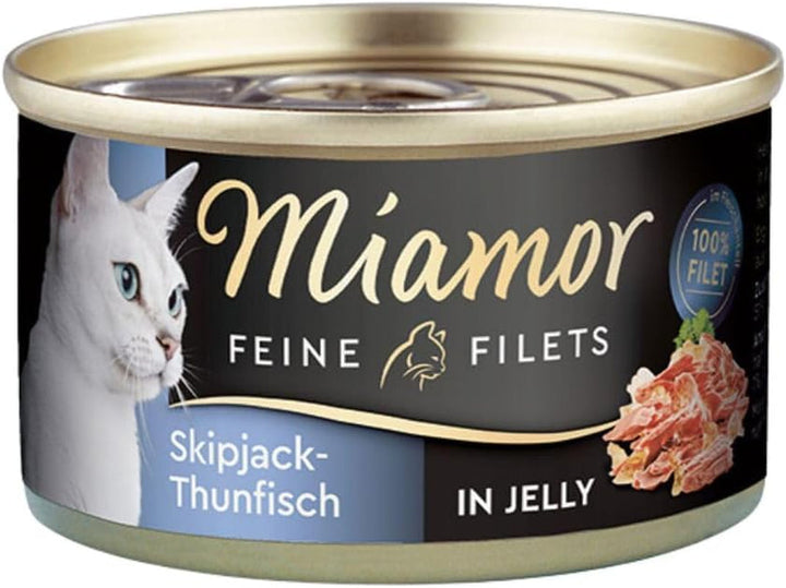 - Fine filets en gelée | Nourriture humide pour chats adultes avec des morceaux de feuilles dans la gelée. Aliments complémentaires avec une teneur faible en gras dans une boîte sans additifs artificiels 24x100g Skipjack Thon
